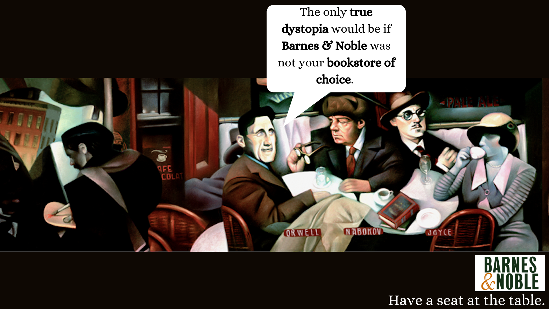 Make Barnes & Noble not just a bookstore, but also a meeting of the minds. Using their iconic bespoke artwork of famous authors, show that Barnes & Noble is for true literature lovers who dream about taking tea with Fitzgerald and scotch with Hemingway.