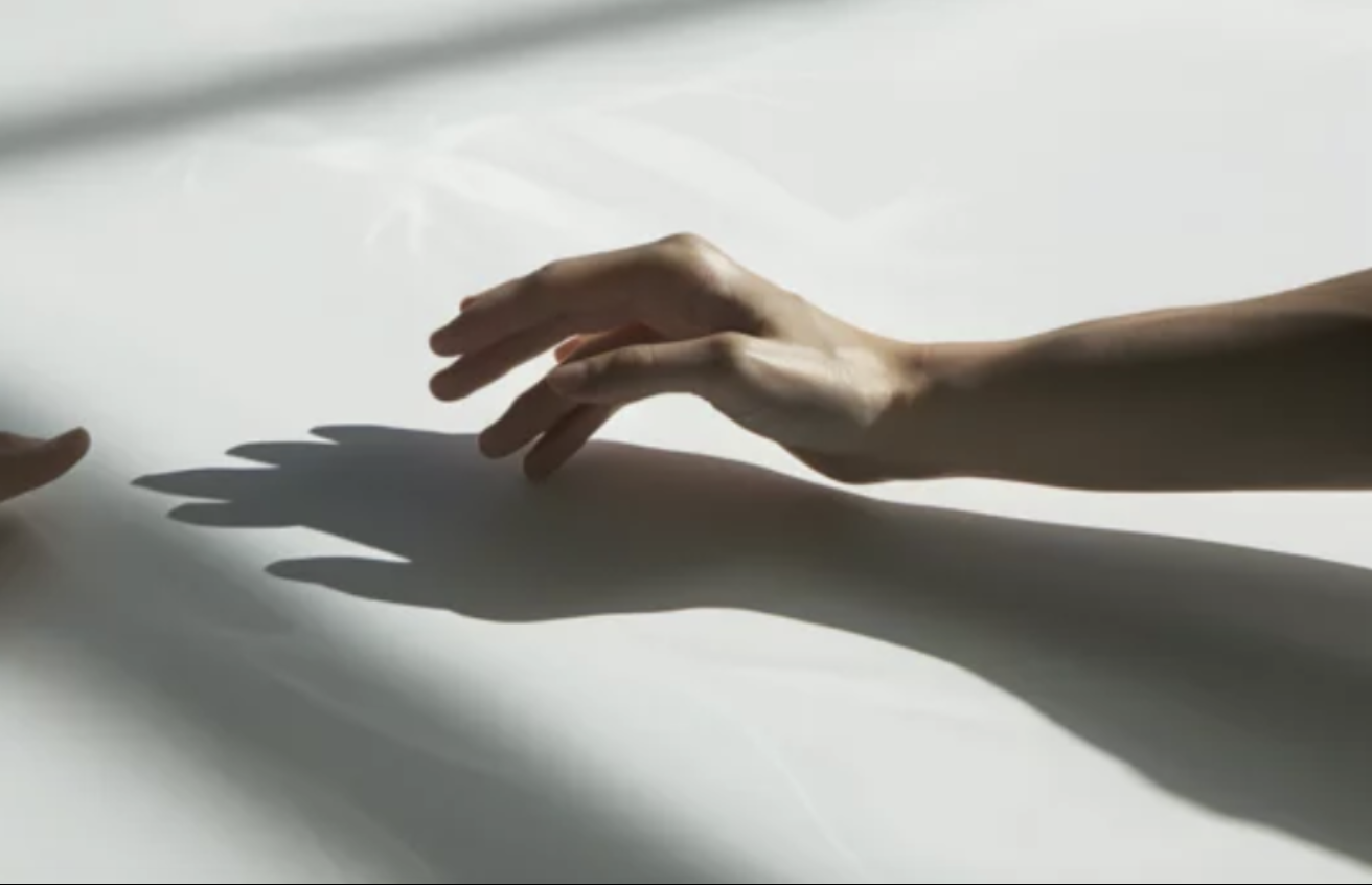 We open on two people sitting next to each other. We can’t see who they are, just that their knees are hovering slightly apart. The hands start to fidget. One reaches for the other, then stops and retreats. The other reaches out, tentatively.