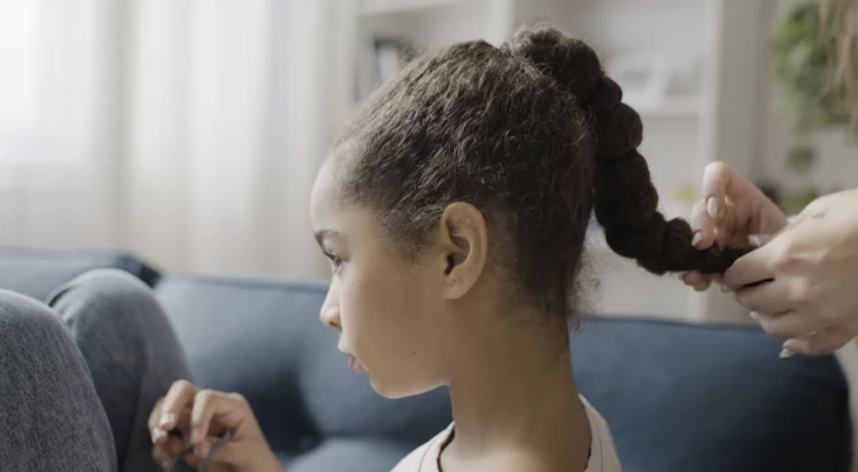 In a small bathroom, a young mother’s hands make their way through her daughter’s hair: teasing it, tying it up, using coconut oil on it. The touch is methodical and caring, like it's been done hundreds of times.